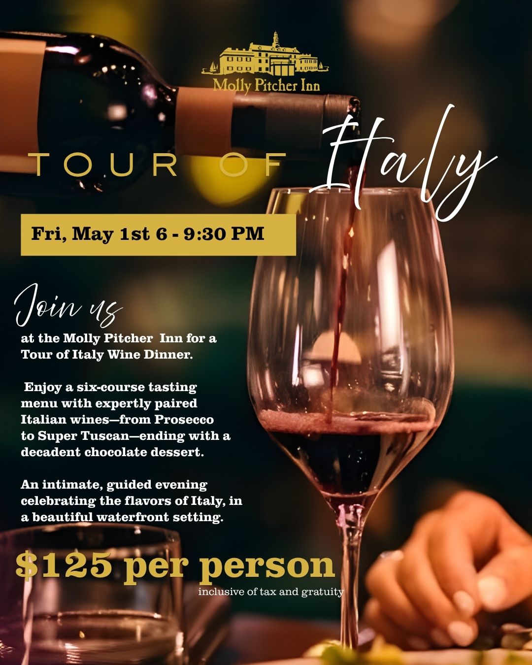 The Dining Room at the Molly Pitcher Inn has panoramic views of the Navesink River. Our contemporary American cuisine is prepared with only the freshest regional ingredients.